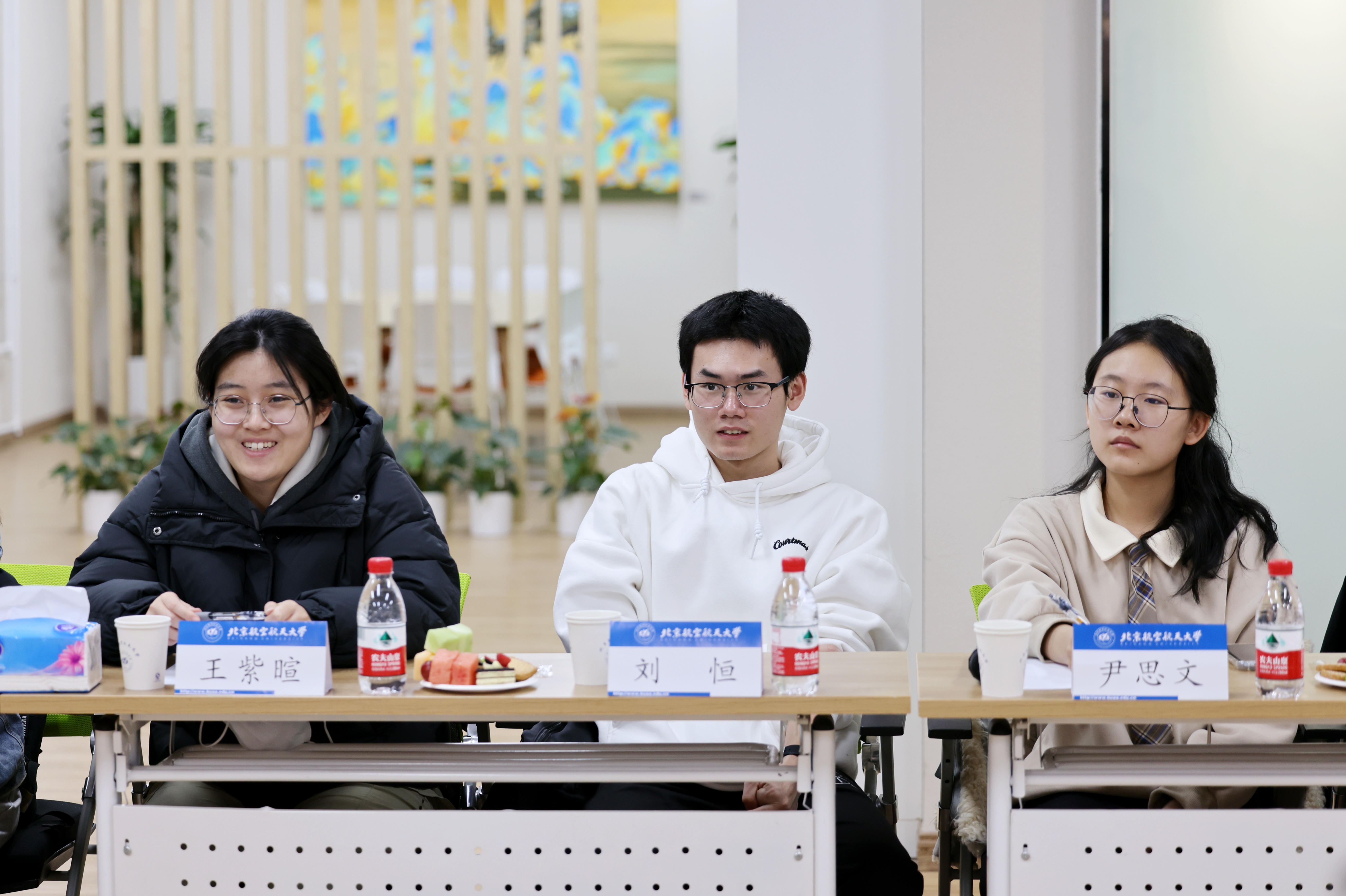 同学们逐一分享了到北航三个月以来的收获和思考,现场气氛热烈。守锷书院廖梓淞、士嘉书院黄乾钊提出了在大一参加科研实践的期待。冯如书院刘恒、守锷书院邱华蕾希望有更多机会走进各专业公司的实验室,以便在专业选择时明确方向。冯如书院王紫暄谈到,在完成课程大作业的过程中,感到自己在资料查阅、文献综述等方面仍需提升能力,且需要加强与其他同学的交流讨论。传源书院周宣伟分享了参加《启航学堂》的感受,并对进一步开放慕课资源提出了建议。