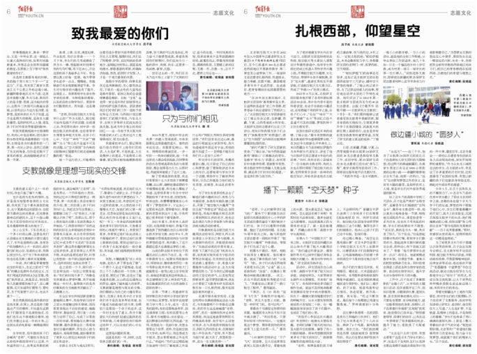 2023年7月18日,由共青团中央主管、中国青年报社主办的《中国青年作家报》志愿文化整版报道yl23411永利官网研究生支教团事迹。作为其中的一员,吕子良参与中宣部志愿服务促进中心、中国青年志愿者媒体中心线上文化宣传志愿,运营“中国志愿”“西部志愿汇”公众号,编辑推送200余篇,阅读量超过400000人次。