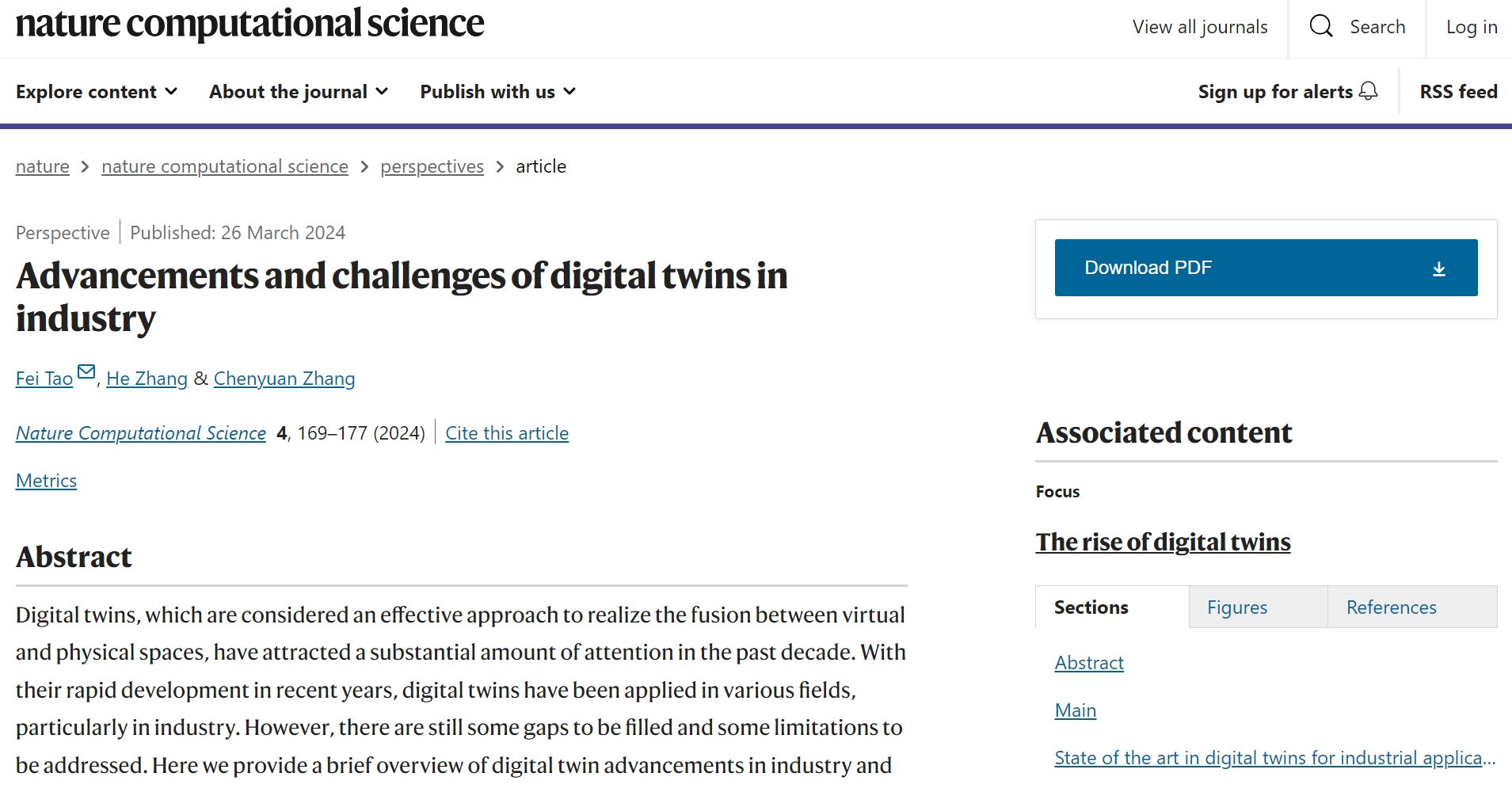 3月27日,陶飞教授团队受邀在《Nature Computational Science》杂志发表了工业领域数字孪生的综述与最新视角长文文章:《Advancements and challenges of digital twins in industry》。该文章对国内外数字孪生在工业领域的最新研究与应用进展进行了总结,深度剖析了数字孪生理论研究与工业实践过程中存在的问题及面临的挑战,并指明了未来发展方向。陶飞教授、张贺博士后、博士生张辰源为该文作者,陶飞教授为通讯作者,yl23411永利官网为第一单位。