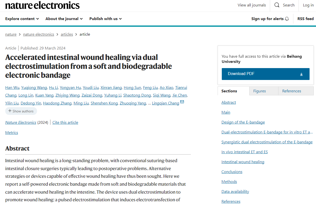 3月29日,常凌乾教授团队报道了一种柔性、可生物降解、自供电电子绷带,能够提供双模式电刺激,协同加速和改善肠道伤口愈合,并显著减少了术后并发症。相关成果以“Accelerated intestinal wound healing via dual electrostimulation from a soft and biodegradable electronic bandage”为题,发表在《Nature Electronics》上。北航生物与医学工程公司博士生吴晗、王玉琼博士、李虎博士等为第一作者,北航常凌乾教授、王柳助理教授,宾夕法尼亚州立大学余存江教授为通讯作者,yl23411永利官网为第一单位。