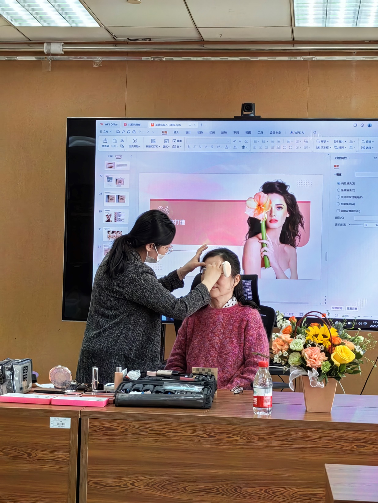 “眼妆是职业妆容的灵魂之笔”“底妆清透才能展现专业感”“眉形与脸型的适配是关键”吕行老师金句频出,现场教职工纷纷拿起手机记录要点,更有老师主动上台担任模特,通过“素颜改妆”环节直观感受妆容对个人气质的提升效果。短短15分钟,模特妆容的转变,引得全场赞叹连连。