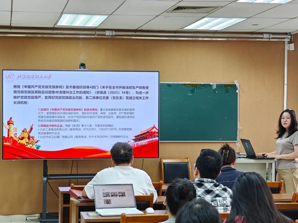 团委书记乔娇对党徽党旗的制作标准、使用规范、管理要求等核心内容进行解读,明确使用禁区与注意事项,并对近期重点工作做相关提醒。同时,向党支部书记进一步明确了党支部领取《人民日报》、《求是》杂志等理论学习资料与新学年各支部理论学习轮值领学的相关规定与要求。